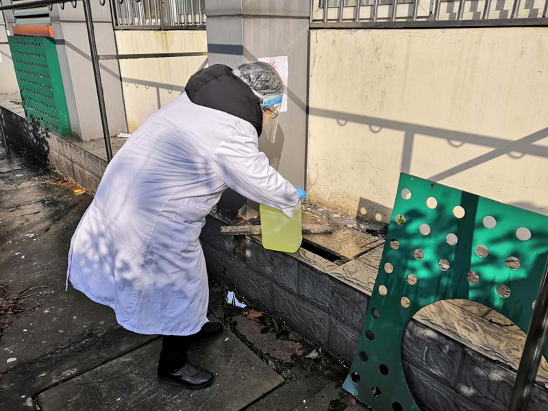 (谭闽月对集中隔离点的化粪池投放消毒剂进行消杀)